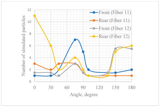 Figure 17 shows the deposition profile along the fiber circumference modeled by DSMC method. In the front side of fiber with respect to flow (for angles between 45° and 135°), deposition is larger compared to the rear side for Fiber 11. For Fiber 12, both front and rear semi-circumferences have larger deposition of particles compared to Fiber 11. Due to the low-speed wake downstream of Fiber 11 (see Figure 8), CVD gas has a larger residence time near the second fiber (Fiber 12) that allows larger and more uniform deposition compared to the first-column fibers.