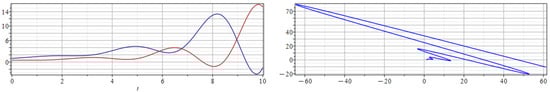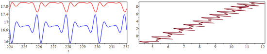 Solution of the linear system of RDDEs (25) over using the LTM (left). The components of the solution are (blue) and (red). Solution in the phase space for (right).