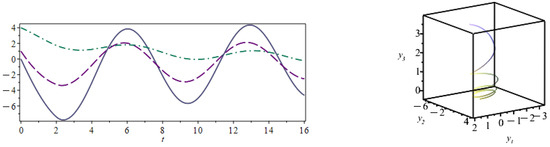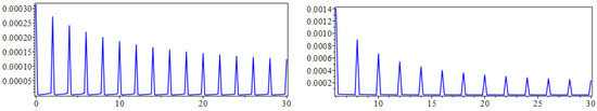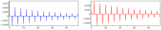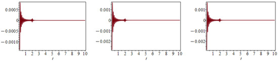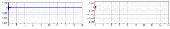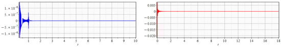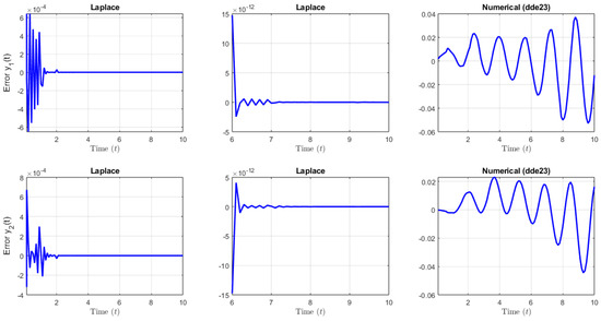 This is a remarkable aspect of some particular linear systems of RDDEs, since this type of dynamic behavior is not achievable for analogous (in this case, first-order ) linear ODE systems. On the left hand-side of Figure 9, we include the graph of the absolute errors of each of the components of the LT solution. The LT solution becomes increasingly more accurate as t increases. For example, the maximum error for is approximately . On the other hand, on the right-hand side of Figure 9, it can be seen that the error of the numerical solution produced by the dde23 built-in Matlab function increases and that it is much larger than the one generated by the analytical LT solution. Similar results have been found for other types of linear DDEs [32,59]. It is important to remark that the truncated LT solution was produced with only 15 terms, and can be evaluated at any time t.