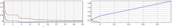 Solution of the linear system of RDDEs (24) over using the LTM (left). The components of the solution are (blue) and (red). Solution in the phase space for (right).