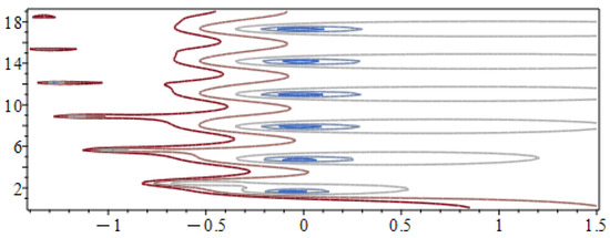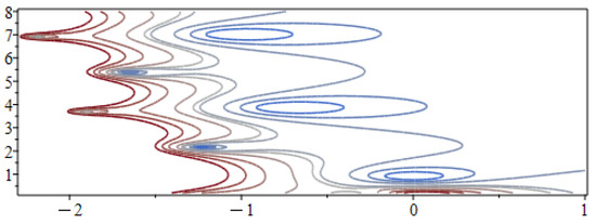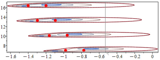 In this example we consider a system where the matrices A and B do not commute. Recall, as mentioned in Section 2, that when this is the case, we cannot obtain exact expressions for both sequences of poles. We can, however, use the formulas given by (18) to obtain estimates for the locus of the two infinite sequences of poles in terms of the Lambert function. These approximates are given by