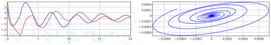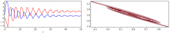 Solution of the linear system of NDDEs (33) over using the LTM (left). The components of the solution are (blue) and (red). Solution in the phase space for (right).