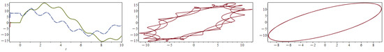 Figure 8 depicts the exact solution given by the MoS and the LT solution. We also include the graphs of the LT solution in the phase space for different time intervals. The solution approaches a limit cycle (an ellipse), but certainly not in an obvious way. Observe that in Figure 8 (plot in the middle), where the t-range has passed well beyond that of the MoS solution, that there is still no compelling evidence to suggest that the solution will eventually stabilize. As a matter of fact the behavior of the solution seems chaotic. This is because the first term in the sum decays very slowly and therefore continues to perturb the limit cycle until around , after which .