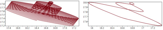 Solution of the linear system of NDDEs (33) in the phase space for (left) and (right).