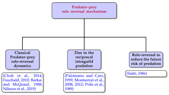 Flow diagram for the categorization of the predator–prey role-reversal feeding mechanism mentioned in some existing literature [7,9,10,11,14,15,16,17,18].