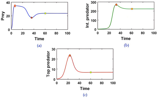 In Figure 16, we show the stability of both of the (intermediate and top) predator-free equilibrium points by using time series with parameter values , and we find that the system (5) achieved stability at the equilibrium point , where both intermediate and top predator populations reach extinction and the prey population reaches K (=35).