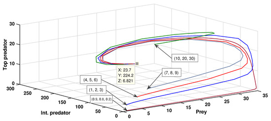 It is worthwhile to note that the stability conditions of the coexisting equilibrium are very complicated. Consequently, it is difficult to explain the biological meaning of such mathematical expressions. We use numerical computations to verify and illustrate the stability of the prey, intermediate predator, and top predator. Figure 3 shows the local stability of the system (5) around the interior equilibrium point . It is noted that the parametric values are mentioned in the figure caption. Figure 4 shows the global stability of the system (5) at for different initial conditions and the other parametric values are mentioned in the corresponding figure caption.