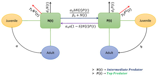 The schematic representation of the tri-trophic food web (5) is depicted here, where the prey species (), middle predator (), and top predator population () are the major concerned groups. Note that we did not include the juvenile and adult stages of the top and middle predator as separate compartments in the modeling structure. It is only provided in this figure for better understanding.