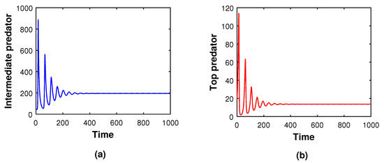 Time series solution of (a) the intermediate predator and (b) the top predator population of the sub-model (6) by considering the parametric values .