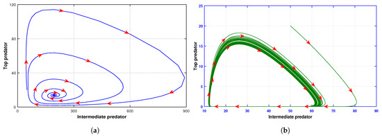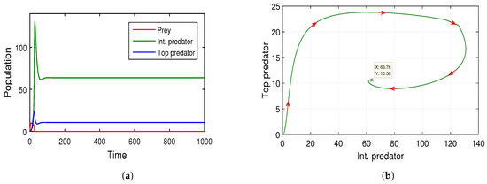 The stability condition of the interior equilibrium signifies that the intermediate predator and top predator populations coexist in a stable manner. However, it is difficult to interpret the explicit biological meanings of the existence and stability conditions of the coexisting equilibrium of the sub-model (6). On account of this, we demonstrated the existence and stability of the intermediate and top predator populations (see Figure 6) using numerical computations with . The status of stability is also reflected by the phase portrait (Figure 7a) of the system (6).