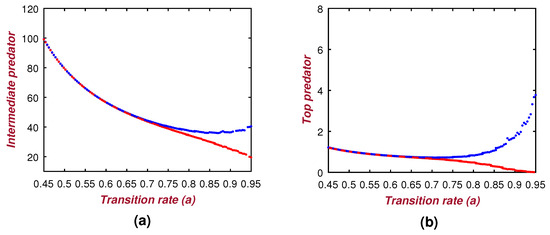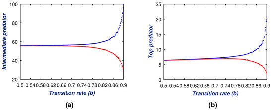 We feel that the most critical phase that drives this growth dynamics (6) is the transition of the juvenile to the adult stage. The rate of transition should be one of the key parameters when maintaining the stability of the ecosystem. Note that any ecosystem’s strength does not always depend on its dynamic movement; instead, it also sometimes depends on the intrinsic growth behavior of the species. The underlying growth actions of any species should be extensively considered through the model parameters involved in that ecosystem [22]. It is evident that due to specific changes in the model parameters, the stability of the corresponding ecosystem is disturbed [3,5]. The efficacy of the bifurcation analysis is too well structured to demonstrate the issue. The bifurcation on any system is defined by the qualitative change of the equilibrium points’ behavior with changing the parameter values. Here, we selected both the transition rate a and b of the intermediate and top predator, respectively, for the bifurcation analysis.