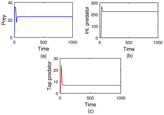 Time-series evolution of (a) the prey, (b) the intermediate predator, and (c) the top predator population for the system (5) around the interior equilibrium point by considering the parametric values .
