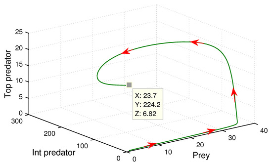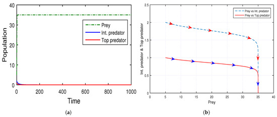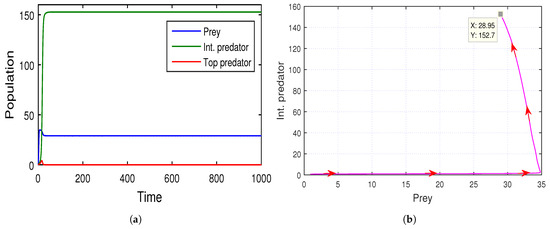 The stability of the prey-free equilibrium point is also demonstrated by the Figure 13a. The figure illustrates that in the absence of the prey population, intermediate predators will face a huge amount of predation risk. The above set of parameter values provides us the prey-free equilibrium point , which is depicted in Figure 13b. We also justify the analytical conditions: (i) , (ii) and (iii) for the stability of the system (5) at the equilibrium point . From this observation, we determined that the predation pressure on intermediate predators by top predators should be high, as there is not enough common prey for both predators to survive. As a consequence, intermediate predators change their role from prey to predator with respect to the super-predator, i.e., the role reversal mechanism takes place in the community for the survival prospect.