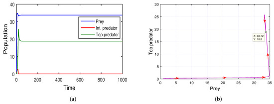 (a) Time-series solution and (b) phase portrait of the system (5) around the top predator-free equilibrium point for .