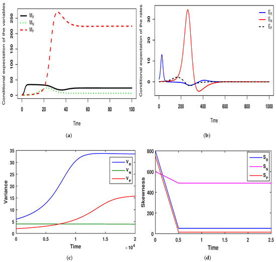 (a) The transient phases and equilibrium distributions of the conditional means, (b) the transient phases and equilibrium distributions of the conditional mean rates, (c) the transient phases and equilibrium distributions of the conditional variances and (d) the transient phases and equilibrium distributions of the conditional skewnesses for the three-species competition model (8). We consider as the magnitude of the hypothetical parameters with , and .