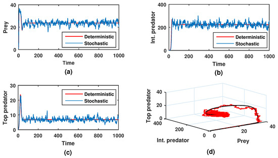Time series evolution of (a) the prey population, (b) the intermediate predator population (c) the top predator population and (d) the phase portrait of the deterministic system (5) and stochastic system (8) by considering as the magnitude of the hypothetical parameters. We also chose , , and for a stochastic environment.