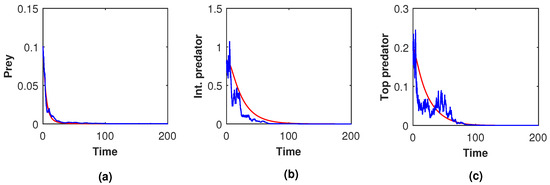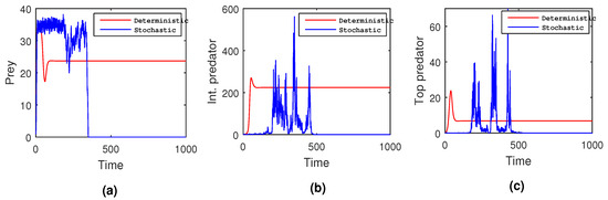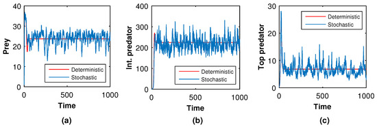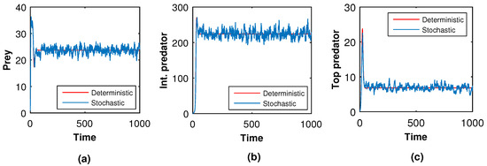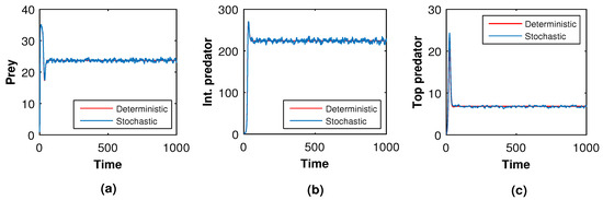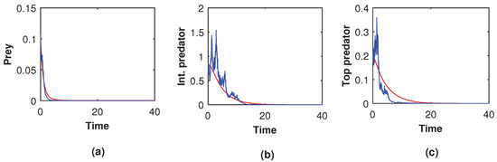 Next, we slowly raised the noise level from low to high to see what happened in the tri-trophic prey–predator interactive food chain system. Then, we showed the solution curves for both deterministic and stochastic systems for different values of the intensity of noise. In Figure 19, Figure 20, Figure 21 and Figure 22, we took the initial conditions , and parameters . The only difference among Figure 19, Figure 20, Figure 21 and Figure 22 is the intensities of environmental changes. Specially, we choose in Figure 19; in Figure 21, we chose and in Figure 22, we chose . From Figure 19, Figure 20, Figure 21 and Figure 22, we observed that the coexisting equilibrium solution curves of the stochastic model (8) always oscillated with respect to the curves of the deterministic model (5). Those figures depicted that if the intensity of the environmental changes increased, the fluctuations of the solution also increased. So, from Figure 19, Figure 20, Figure 21 and Figure 22, we arrived at the conclusion that the decrease in values of , , and fluctuations fo the solution curves of the stochastic system were reduced and coincided with that of the solution curves of the deterministic system.