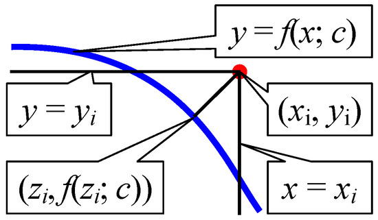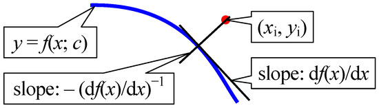 Using (Equation (5)) instead of (Equation (4)) is yet another approximation in finding the optimal values of the parameters (c) that provide the best fit of the selected model () to the experimental data (, ). However, the objective function is the sum of residuals with the same direction as the perpendicular offsets, and its maximum is the sum of the squared perpendicular offsets. If the values proposed by the approximated perpendicular offsets still do not fully meet accuracy requirements, then the initial values for the exact approach of perpendicular offsets can definitely be used as a new guess, thus accelerating the convergence of the model and PV cell parameters.