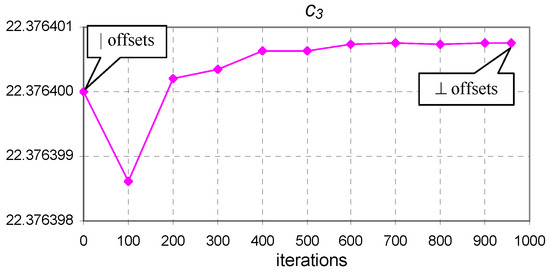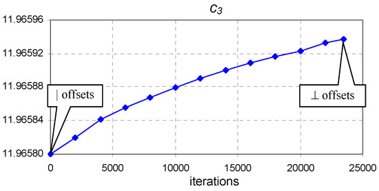 Figure 8, Figure 9 and Figure 10 show that only the coefficient exhibited visible changes. The reason for this behavior is that the perpendicular offsets are nearly as long as the vertical ones, the length of the horizontal offset being much longer in comparison. For convenience, the values of the horizontal and vertical offsets for the optimum values of the coefficients are easily extracted from the values presented in Table 4.