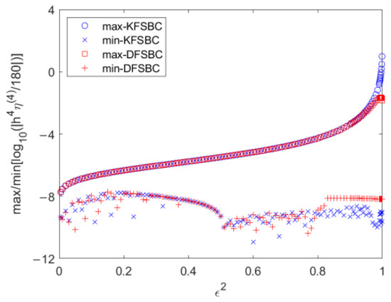 To indicate the possible global error of Simpson’s rule on integrating water surfaces using KFSBC or DFSBC, the maximum and minimum values of the absolute GErr at all positions kxj (j = 0, 1, …, N) are shown in Figure 1 for ε2 from 0.05 to 0.9999. The vertical axis indicates the value of the absolute GErr. The values of the absolute maximum GErrs using the water surfaces of KFSBC and DFSBC are equivalent and vary from −8 to −4 for ε2 < 0.8. For ε2 > 0.8, the values of both maximum absolute GErrs gradually become different, even up to 1 and −2 at the case of ε2 = 0.9999. The absolute GErrs of KFSBC are greater than those of DFSBC. The maximum absolute GErr for all cases occurs at the crest, and the minimum absolute GErr occurs near the zero water surface. The value of GErr depends on the fourth derivative of the water-level function at any point kx, as shown in the appendix. Equation (6) shows that the water surface is expressed by a sum of the cosine function. The cosine function has a recurrent fourth derivative. When kx = 0 on the crest, the fourth derivatives of all cosine functions are 1 so that the sum of the corresponding derivatives associated with positive coefficients, Bn, is larger than those at other positions. For the same reason, when kx is close to π/2 near the zero water level, the fourth derivatives of all cosine functions are approximated to zero so that the sum of the corresponding derivatives is minimum rather than at other positions.