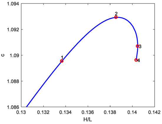Table 4 lists the values of the wave speed and the corresponding steepness of four points. The FSA also shows a nonmonotonic variation of wave speed with wave steepness without a loop as that obtained by Tanaka [56] and Lukomsky et al. [62,63] for the almost-limiting waves.