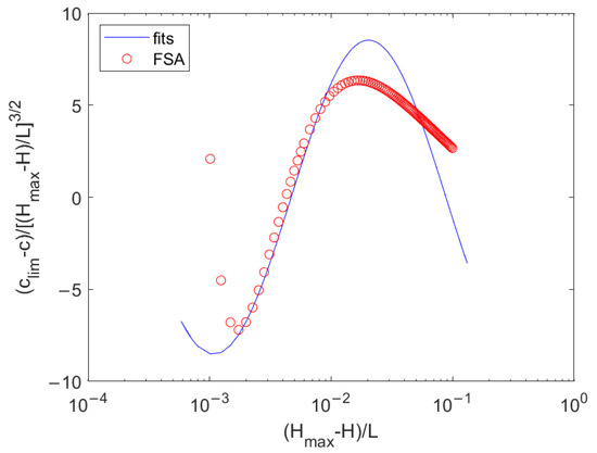 Using the clim and Hmax/L obtained by Lushnikov et al. [35], the values on the left side of Equation (18) obtained using the FSA and the fits on the right side of Equation (18) are shown in Figure 5. Figure 5 indicates a good agreement between the obtained ratios and the fits for the values of (Hmax − H)/L within 0.002 and 0.007 but gradually large differences for the values of (Hmax − H)/L less than 0.002. The result indicates that the FSA has a low accuracy, as the wave speed deviates clearly from that of Lushnikov et al. [35] for almost-limiting waves. The inaccuracy may result from the fact that the FSA is incapable of simultaneous satisfaction with KFSBC and DFSBC near the crest.
