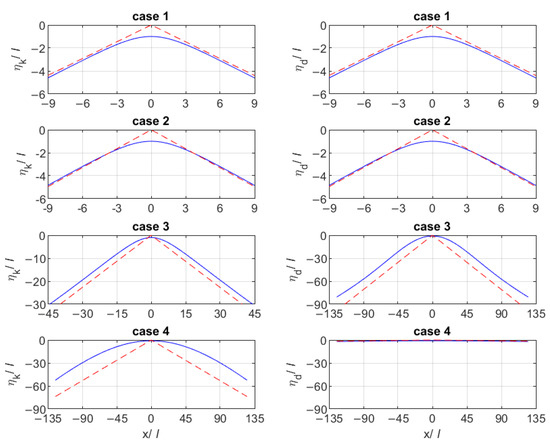 The values of l for the four cases of Table 4 are 4.7639 × 10−2, 1.8066 × 10−2, 8.0094 × 10−4, and 3.9962 × 10−6, respectively. When the coefficients Bn (n = 1, …, N), c, Q, and B are determined, the inner profile at any position can be calculated using Equations (6) and (7), respectively. The results are denoted by ηk and ηd. The inner wave profiles for the four cases are shown in Figure 6, of which the angled bilinear roof is denoted by dashed lines.
