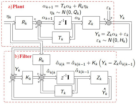 Kalman filter estimation: (a) Block algebra of the Plant, (b) block algebra of the Kalman filter.