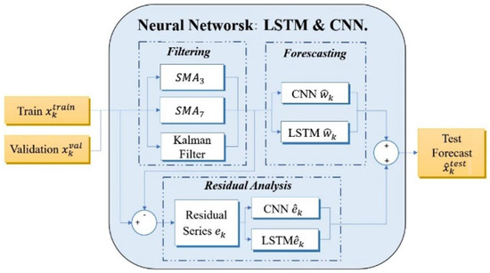 A properly filtered time series is reduced in complexity, facilitating the extraction of trends and harmonics of the DL forecasting methods. An important component of any neural network architecture, like LSTM or CNN, is that it allows the emulation of nonlinear systems by including small nonlinearities in the activation functions. Thus, these filter signals may be able to learn the complex patterns of the real model [24]. One of their disadvantages is the exploding gradient, which occurs when an RNN’s associated error is too small, making the training short and susceptible to being stopped at a local minimum when the hyperbolic tangent activation function is employed. On the contrary, when an activation function is activated near the extremes, a large associated error is assigned to this neuron, which may be ignored by the algorithm, causing a vanishing gradient [25]. Due to this situation, and looking to perform an adequate forecast, the LSTM and CNN architectures are among the most stable for approximating nonlinear systems employing a neural network training system [25,26].