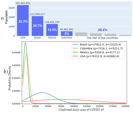 Forecasting chaotic time series presents a formidable challenge across various domains, from public health to economics, where predicting future values over time is crucial [1,2]. Such time series’ inherent unpredictability and complex dynamics often render conventional forecasting methods inadequate. These time series have irregular trends, sudden shifts, and numerous external influences, leading to significant impacts across diverse societal sectors [3]. The challenge is further compounded by the problematic issues of missing data, outliers, and measurement noise, particularly evident during the COVID-19 outbreak [4,5]. In this context, the time series of COVID-19, especially in the American continent’s most populous countries, exemplifies this complexity. High population densities drive chaotic dynamics, making countries like Mexico, the United States, Colombia, and Brazil ideal for this study. Their geographical proximities—Mexico with the USA and Brazil with Colombia—and similar population disparities offer a valuable comparative perspective.