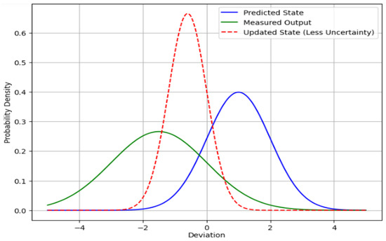 Based on the outcomes obtained from the filters, we found that the forecast performance improves when utilizing filters that effectively isolate the underlying trend and primary seasonal patterns. Furthermore, we employed the KF due to its remarkable capacity to reduce uncertainty. As shown in Figure 10, the process involves an initial predicted state in blue. Subsequently, this predicted state is refined through an update step, incorporating the measured output in green. This enhancement is achieved by applying a weighting factor known as Kalman gain (). The was tailored to the noise in the variance–covariance matrix, and the system model, diminishing the uncertainty associated with the update state, is shown in the red dashed line [5,23,32].