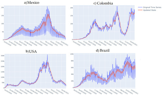 We applied filters to different time series of the countries mentioned previously to enhance the forecast, where , and . We found that the resulting filtered time series are more similar when is increased, allowing for the appreciation of general patterns. Figure 9 displays the following four countries analyzed in this work: Mexico, the United States, Colombia, and Brazil. In the graph, the raw time series is represented in deep blue, the in red, in green, in purple, in orange, and in sky blue. The time series spans from March 2020 to May 2021.