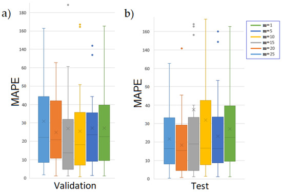 Figure 12 displays the forecast performance in a box plot measured with MAPE, wherein on the left-hand side is the validation, and on the right-hand side is the test. In this way, we show the central tendency and identify the outliers. The test forecast depends on selecting the best performance in the validation set through executions. We conducted a search ranging from = 1 to 25 to determine the optimal value. It is essential to note that, to prove the robustness of the approach, we ran the algorithm 30 times in order to adhere to the central limit theorem. For instance, for CNN with , 5 training sessions are generated, and only the trained model with the best RMSE on the validation set is selected to make the test forecast. This search of is then repeated at least 30 times to generate a sufficient set of test forecasts that efficiently represent the performance of the search.