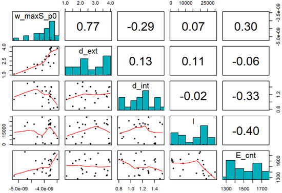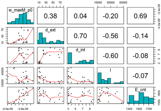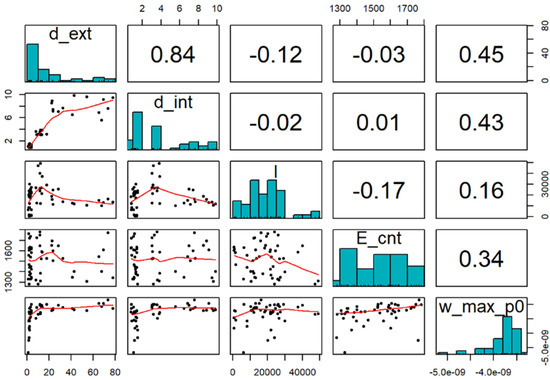 Figure 6 depicts a matrix plot considering the correlations among the parameters associated with the plates with MWCNTs. As one can conclude, in this case, the strongest correlation to the maximum transverse deflection of the plates is observed for the Young’s modulus. A weaker, moderate correlation is observed for the external diameter.
