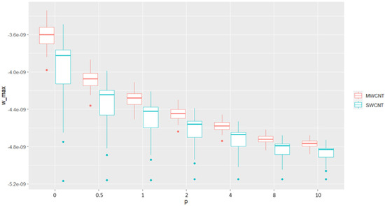 In this work, both single-walled (SWCNT) and multi-walled (MWCNT) CNTs were used to integrate the plates, but separately. In Figure 4, we can see the maximum transverse displacement for the different values of the power-law exponent () in the two cases. It is possible to conclude that the maximum transverse displacement differs with the type of CNT.