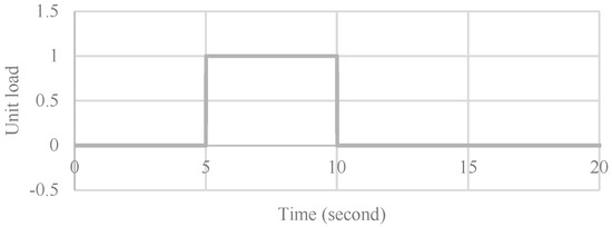 Figure 5 showcases the depiction of the second load, appropriately scaled to a value of 1. This load is constructed through the sequential application of two step functions, with the second step function being activated 5 s after the initiation of the first step function.