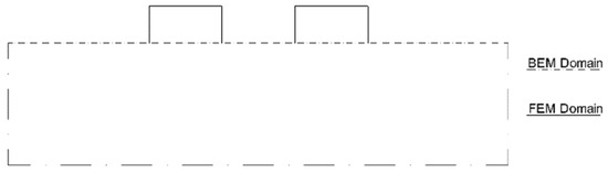 In the proposed coupled finite element-boundary element method (FEM–BEM) approach, the body of the soil is modeled using the BEM, while the structures are modeled using the FEM. The soil body is discretized into a total of 66 elements, while each structure is represented by 4 beam elements. Thus, the overall model in the proposed approach consists of 74 elements. Figure 7 visually illustrates the model created by the proposed approach, highlighting the reduced number of elements compared to other methods and resulting in decreased computational effort.