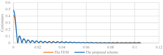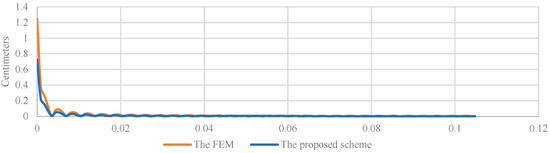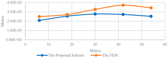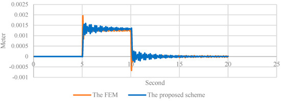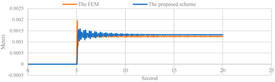 Similar to the initial loading phase, a significant similarity is observed in the displacement observed at the first node of the primary structure between the proposed method and the FEM. This parallelism becomes evident when comparing the outcomes obtained from both approaches. To visually represent this comparison, Figure 9 presents the results for the second loading scenario within the context of the evaluation problem.
