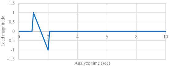 Two external loads are exerted on the model under consideration. Figure 4 illustrates a schematic representation depicting the first applied load, known as the Heaviside load. The load in the figure is scaled to a unit load and further modified by the loading factor.