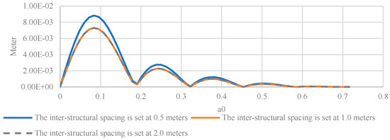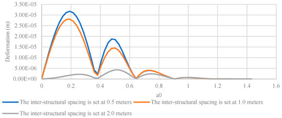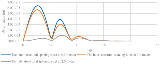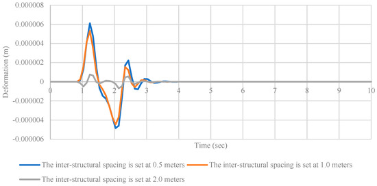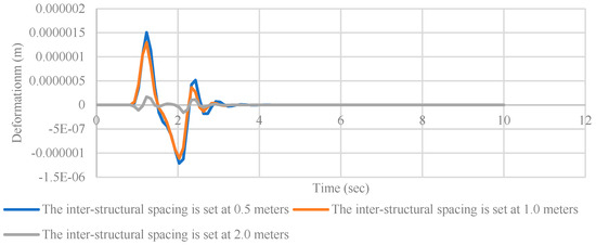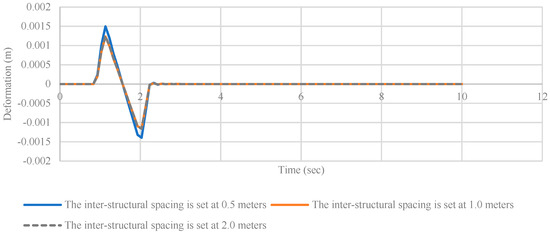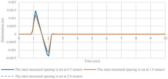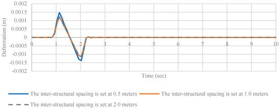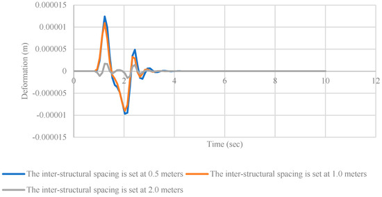 As evidenced in Figure 15, Figure 16, Figure 17 and Figure 18, augmenting the inter-structural distance between structures subjected to external loading significantly impacts the deformation of the recipient structure that receives the wave from the loaded structure. Conversely, the structural element on which the load is applied exhibits a relatively minor response to the increasing inter-structural distance.