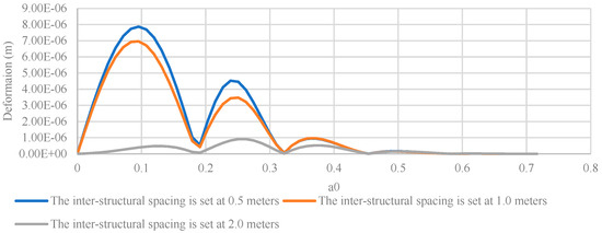 The subsequent analysis explores the deformation patterns observed in the second structure under different inter-structural spacings. Similar to the first structure, the deformation results are presented both in the time domain and in the dimensionless domain represented by a0. Figure 17 depicts a comparative analysis of deformation patterns within the time domain for the roof of the second structure, considering various inter-structural spacings.