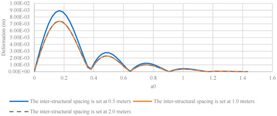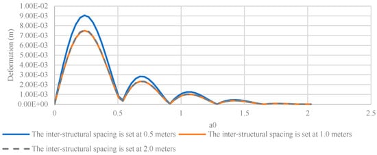 The results derived from the deformation analysis performed on the first structure reveal that the inter-structural spacing exerts an influence on the deformation experienced by the first structure, albeit with a relatively modest degree of modification. This effect can be attributed to two possible factors: the impact of the second structure on the soil’s stiffness or the inertial wave generated by the second structure, affecting the first structure. Figure 16 illustrates the impact of the second structure on the deformation characteristics of the first structure, specifically observed within the dimensionless domain denoted as .