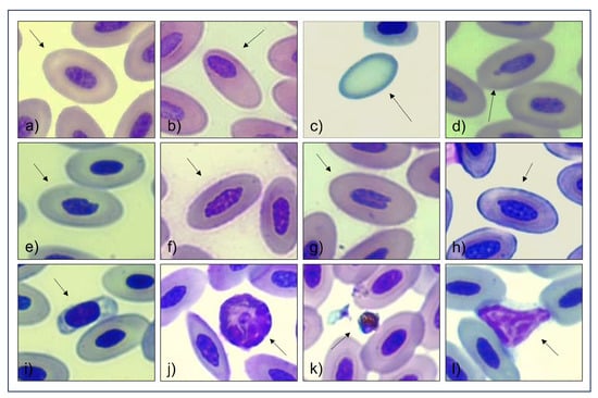 (a) Normal, (b) displaced, (c) enucleated, (d) micronucleus, (e–h) irregular, (i) other (thrombocyte), (j) other (heterophil), (k) other (artifact), and (l) other (lymphocyte).