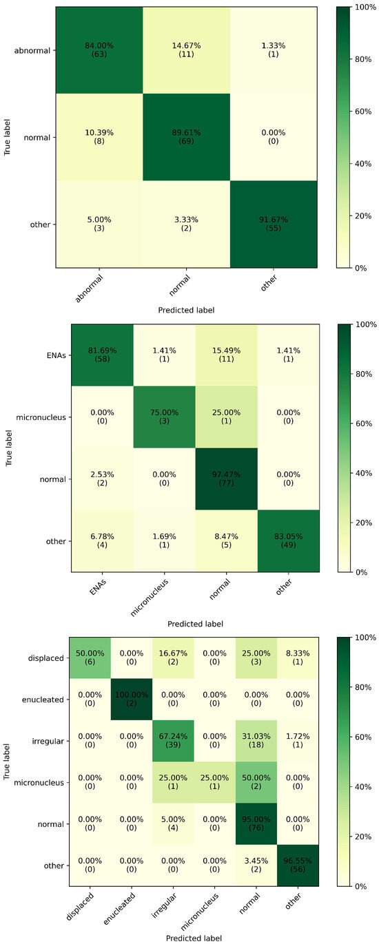 Finally, in analysis 3, the model further refines the classification by introducing even more detailed categories. In this level, the “ENAs” category is subdivided into “displaced”, “enucleated”, and “irregular”. At this stage, both accuracy and F1-score show a decline, of 4.1% and 11.7%, respectively, compared to the metrics of the model at the first level of analysis. Similar patterns of misclassification persist in this subsequent classification level. Notably, the confusion matrix reveals that classes such as “displaced”, “irregular”, and “micronucleus” exhibit lower rates of true positive classifications. In contrast, the “enucleated”, “normal”, and “other” classes are almost perfectly classified. Furthermore, there is a tendency for false positives to be misclassified as either “irregular” or “normal” in certain cases.