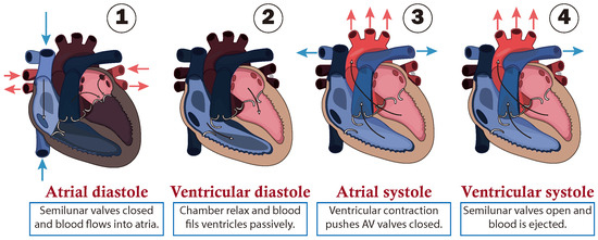 From a functional point of view, the cardiac cycle is divided into two alternating phases: diastole (dilatation period) and systole (contraction period), which are simplified into four stages as shown in Figure 1:
