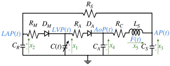 The model discussed in this work is based on an electrical representation of the CVS, as proposed in [4,7,12]. The choice of this model is motivated by the need for a comprehensive model that can be validated from a medical perspective and is capable of describing cardiovascular phenomena, such as valve pathologies, which are among the primary risk factors for cardiovascular diseases (CVDs). This model primarily targets the left chambers of the heart, assuming that voltages are analogous to pressure and currents are analogous to blood flow. The systemic resistance is the resistance to flow from the descending aorta through the capillary vessels, venous, and pulmonary circulation to reach the left atrium. Left ventricular pressure (LVP) is represented by the voltage across the time-varying contractile capacity , where its capacitance is defined as the inverse of left ventricular elastance . The term represents the elastance of the heart at time t, which is a function of the pressure. The mitral and aortic valves are represented as ideal diodes, and , in series with resistance and , respectively. The capacitor , represents the elasticity of the ascending aorta, simulating the pressure variations caused by the opening and closing of the aortic valve. Finally, the remaining components model the anatomical characteristics of the circulatory system, including the elasticity represented by , inertia (), and resistance of the descending aorta [6]. The electrical model circuit in Figure 2 has been thoroughly analyzed in [6,20].