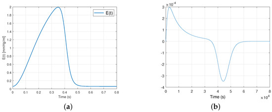 The elastance function is implemented using a number of mathematical approximations, including , the so-called “double hill” [24]. In this paper, represents the normalized elastance at time . “Normalized” means that it has been adjusted or expanded to fit a specific range, often between 0 and 1 or and 1. The normalized elastance is scaled proportionally between and . Specifically, when , equal , and when , equal . In the context of the cardiovascular system, describes how elastance dynamically varies over time adjusted to heart rate, and this relationship is expressed by: