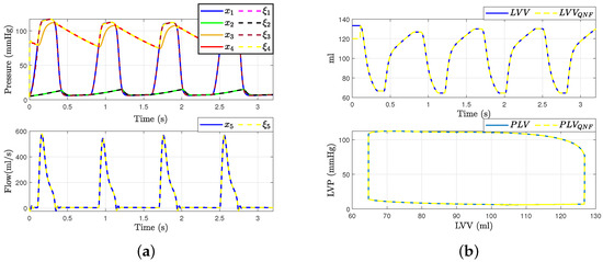 This section presents the validation process for the quadratic normal form of the CVS model obtained, drawing upon previously established validations and incorporating diverse analytical perspectives, as detailed in seminal works such as [6,17]. Initially, the model’s accuracy is substantiated by juxtaposing the waveforms of principal variables, as depicted in Figure 4, against empirical data from healthy subjects reported in [6]. Subsequently, the model’s robustness is assessed through its responsiveness to alterations in preload and afterload factors, ensuring its consistency and reliability in simulating physiological conditions.