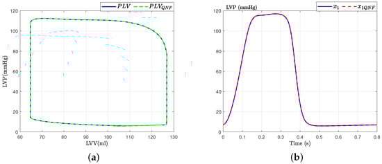 The validation of the model also involves a dynamic analysis concerning preload and afterload factors. To evaluate this aspect, we analyze the preload and afterload signals generated by both the original and the quadratic normal form of the CVS model. Figure 5b displays the left ventricular pressure data and the corresponding pressure–volume loop obtained from our model using a volume of mL. It is observed that the dynamics obtained are consistent with those described in [6].