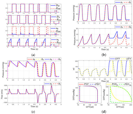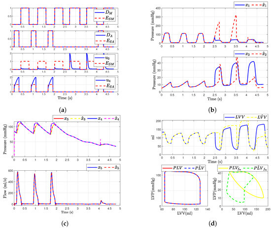 However, we demonstrate that the SMO has the capacity to adapt to the change in in system dynamics. Furthermore, the observer is able to reconstruct the unobservable state when the failure occurs; however, only the states , , and can be convergent again to the true state, while states and have a constant error, as depicted in Figure 9b. Additionally, we were able to determine the left ventricular volume and preload volume using the response described by expression (1), assuming that the heart is healthy, as illustrated in Figure 9d. Here is the original model and is the estimated signal provided by the observer (for ). On the other hand, when a failure occurs, the SMO is unable to accurately estimate the volume due to the loss of , as shown in the comparison between the original model and the observer-estimated model (Figure 9d).
